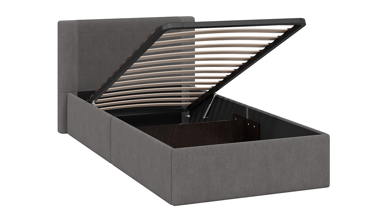 Функциональность. Кровать оборудована подъемным механизмом, обеспечивающим верхнюю фиксацию и удобный доступ к месту для хранения, а усиленная царга и металлическая распорка повышают прочность конструкции.