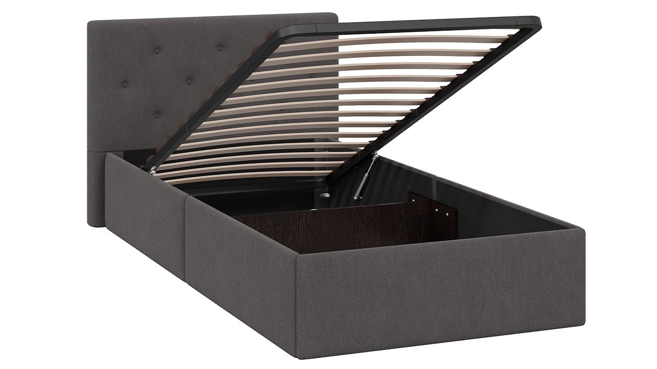 Функциональность. Кровать оборудована подъемным механизмом, обеспечивающим верхнюю фиксацию и удобный доступ к месту для хранения, а усиленная царга и дополнительное металлическое соединение повышают прочность конструкции.