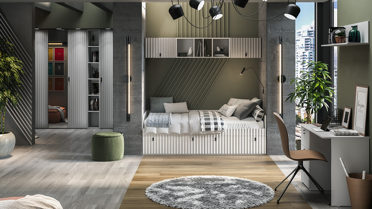 Дизайн. Фасады МДФ с оригинальной волнообразной фрезеровкой, придают мебели динамичность и уникальность. Специальная пленка soft-touch создает бархатистую поверхность, которая радует тактильными ощущениями при каждом взаимодействии. Элегантные линии и проработанные детали создают атмосферу изысканности, идеально соответствуя актуальным трендам в дизайне интерьеров. Фрезеровка столешницы имитирует фрезеровку фасадов, обеспечивая безопасность ребёнка благодаря отсутствию острых углов.