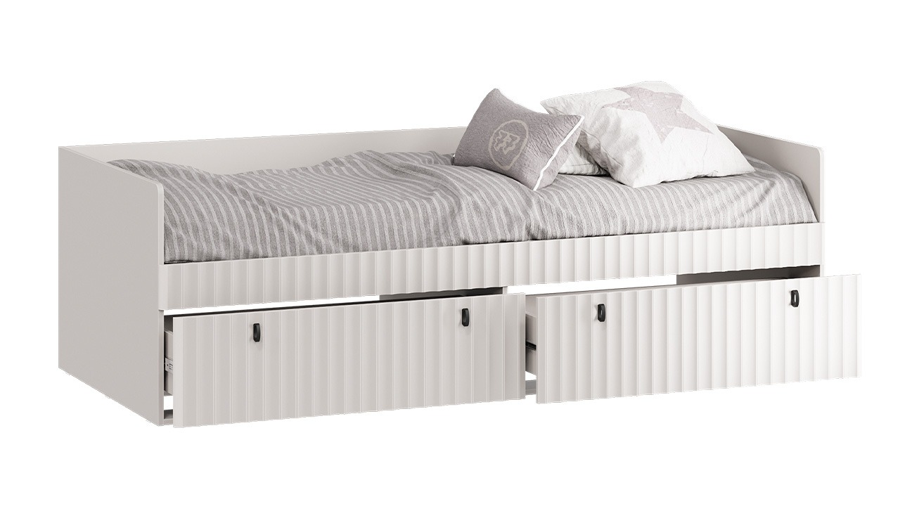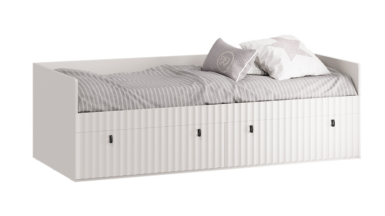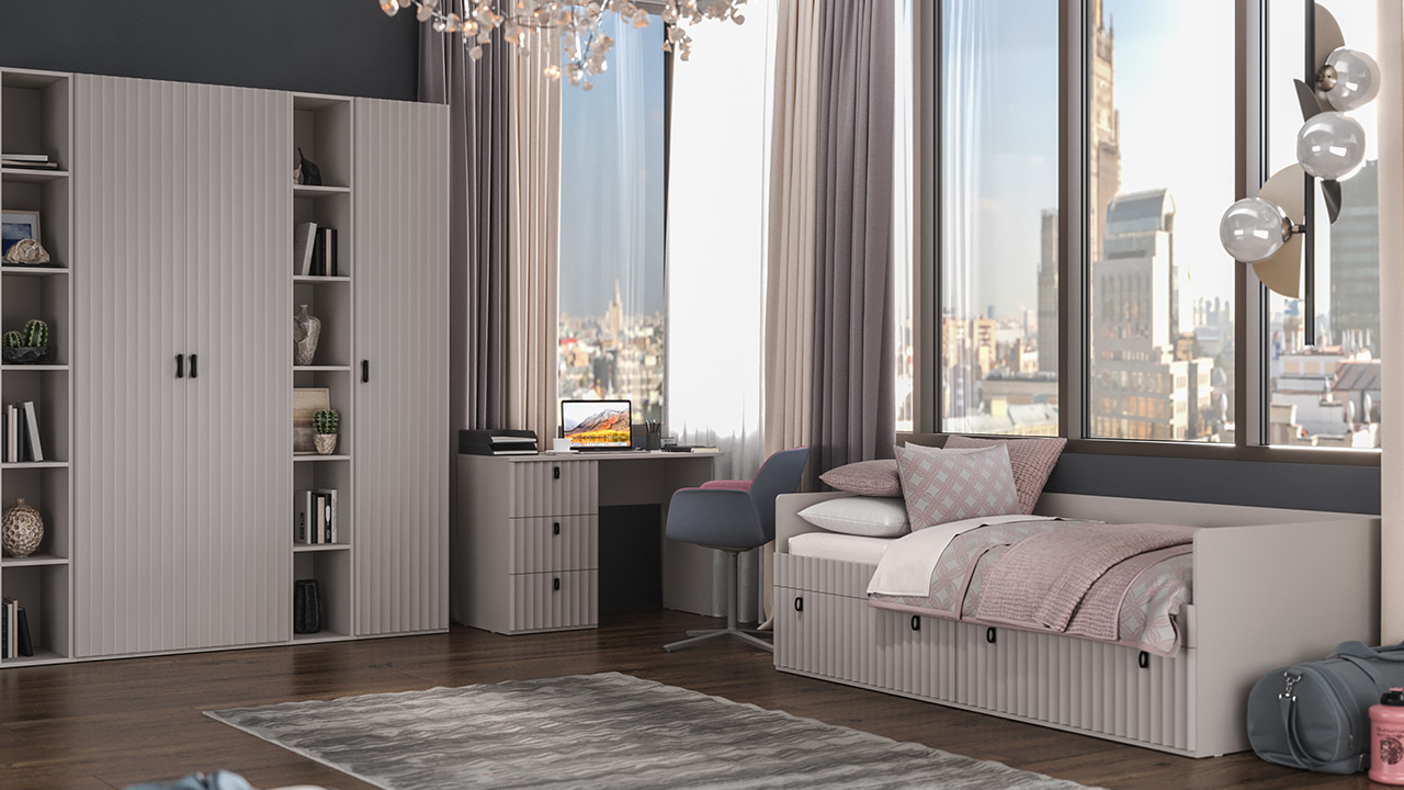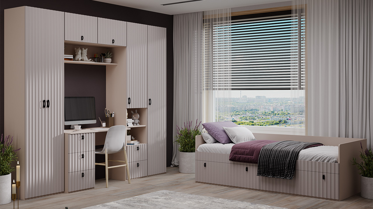 Дизайн. Фасады МДФ с оригинальной волнообразной фрезеровкой, придают мебели динамичность и уникальность. Специальная пленка soft-touch создает бархатистую поверхность, которая радует тактильными ощущениями при каждом взаимодействии. Элегантные линии и проработанные детали создают атмосферу изысканности, идеально соответствуя актуальным трендам в дизайне интерьеров. Фрезеровка столешницы имитирует фрезеровку фасадов, обеспечивая безопасность ребёнка благодаря отсутствию острых углов.