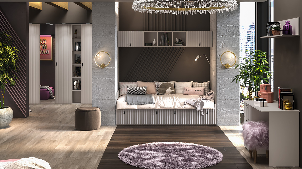 Модульность. Детская коллекция мебели «Тиффани» представляет собой модульную систему, включающую все необходимые элементы: удобную кровать со спальным местом 900х2000, письменный стол с тремя полноценными ящиками для хранения, навесной шкаф и полки для книг, шкафы для одежды, белья и хранения различных предметов. Вы можете самостоятельно подобрать нужные модули и создать идеальную композицию, адаптированную к размерам и особенностям детской комнаты в соответствии с вашими потребностями и предпочтениями. Коллекцию также можно дополнить модулями из действующих модулей спальни. Коллекция Тиффани одинаково хорошо будет выглядеть как в детской комнате, так и кабинете.