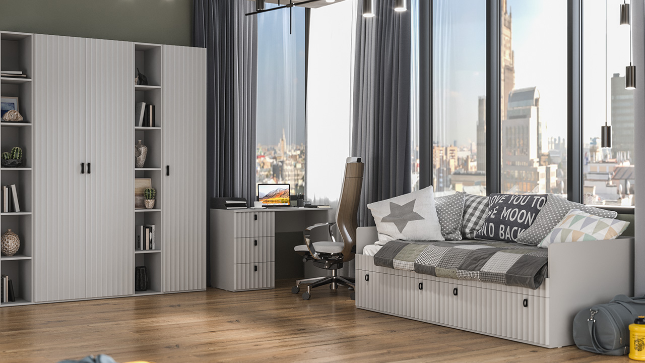Дизайн. Фасады МДФ с оригинальной волнообразной фрезеровкой, придают мебели динамичность и уникальность. Специальная пленка soft-touch создает бархатистую поверхность, которая радует тактильными ощущениями при каждом взаимодействии. Элегантные линии и проработанные детали создают атмосферу изысканности, идеально соответствуя актуальным трендам в дизайне интерьеров. Фрезеровка столешницы имитирует фрезеровку фасадов, обеспечивая безопасность ребёнка благодаря отсутствию острых углов.