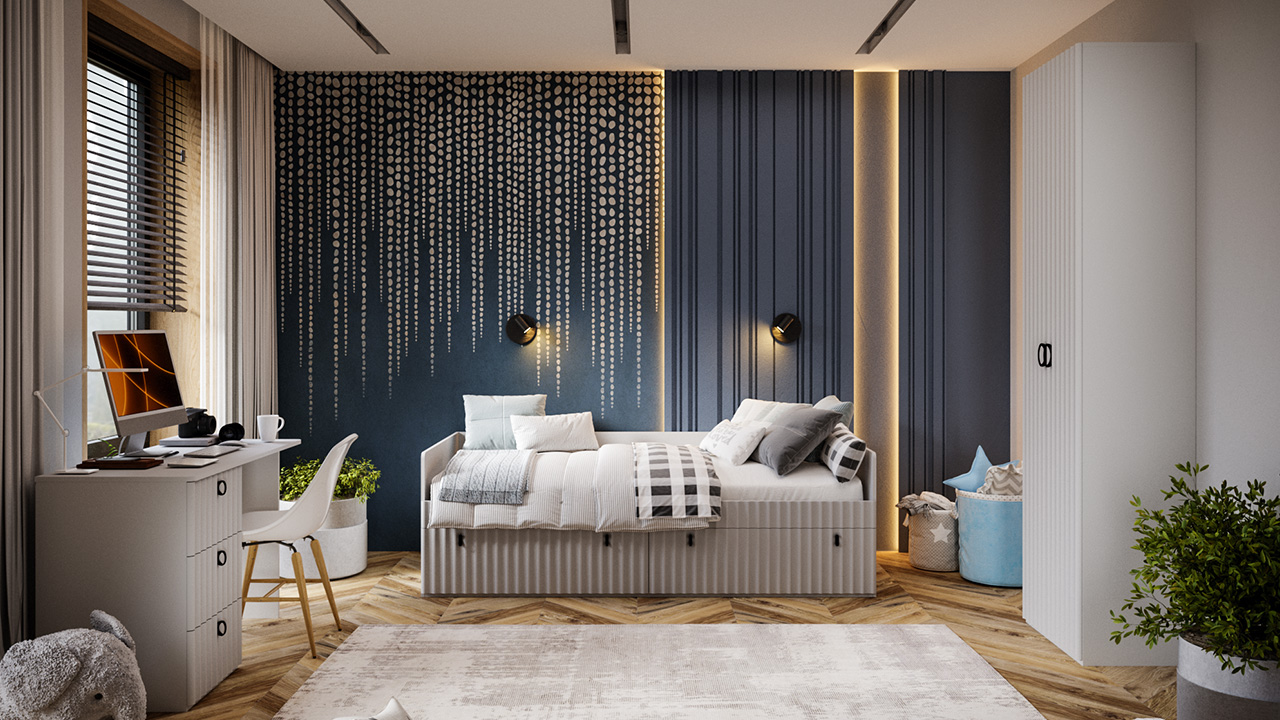 Дизайн. Фасады МДФ с оригинальной волнообразной фрезеровкой, придают мебели динамичность и уникальность. Специальная пленка soft-touch создает бархатистую поверхность, которая радует тактильными ощущениями при каждом взаимодействии. Элегантные линии и проработанные детали создают атмосферу изысканности, идеально соответствуя актуальным трендам в дизайне интерьеров. Фрезеровка столешницы имитирует фрезеровку фасадов, обеспечивая безопасность ребёнка благодаря отсутствию острых углов.