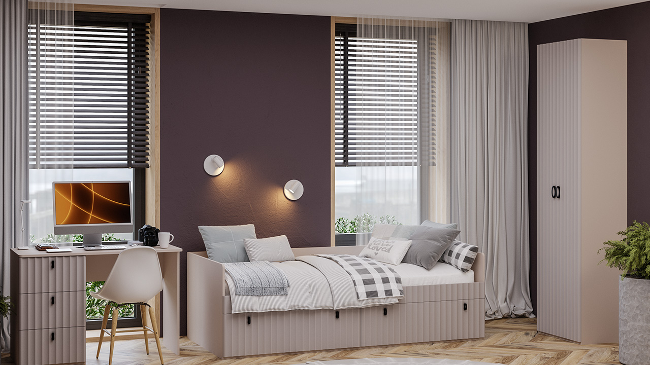 Модульность. Детская коллекция мебели «Тиффани» представляет собой модульную систему, включающую все необходимые элементы: удобную кровать со спальным местом 900х2000, письменный стол с тремя полноценными ящиками для хранения, навесной шкаф и полки для книг, шкафы для одежды, белья и хранения различных предметов. Вы можете самостоятельно подобрать нужные модули и создать идеальную композицию, адаптированную к размерам и особенностям детской комнаты в соответствии с вашими потребностями и предпочтениями. Коллекцию также можно дополнить модулями из действующих модулей спальни. Коллекция Тиффани одинаково хорошо будет выглядеть как в детской комнате, так и кабинете.