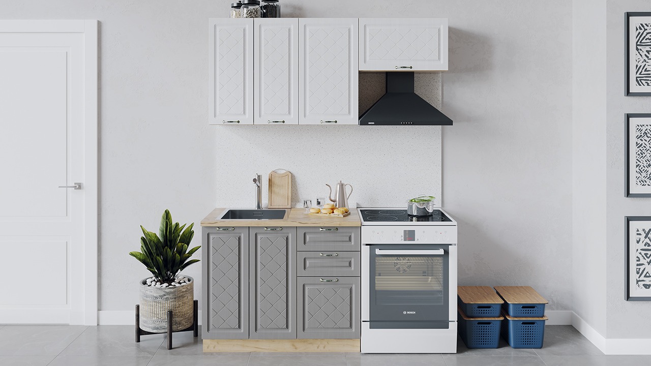 | Габаритный размер набора модулей без учета газовой плиты1 600 | Оттенок фасадаБелый, Серый | Цвет ручкиБрашированная старинная бронза |