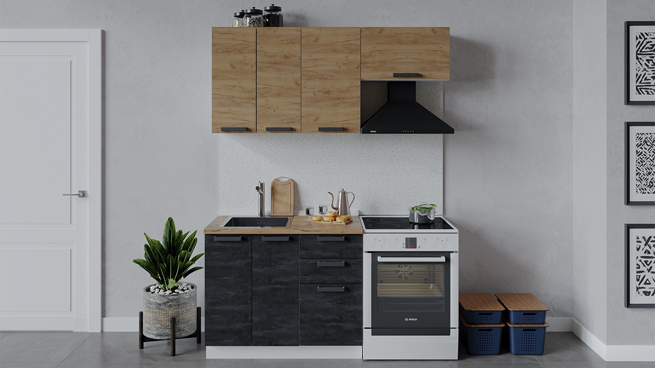 | Габаритный размер набора модулей без учета газовой плиты1 600 | Оттенок фасадаКоричневый, Черный | Цвет ручкиЧерный |