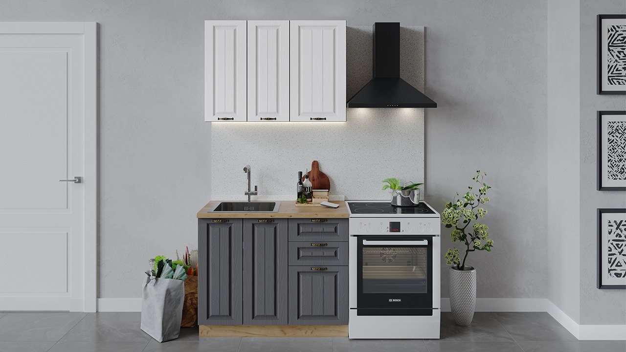 | Габаритный размер набора модулей без учета газовой плиты1 000 | Оттенок фасадаБелый, Серый | Цвет ручкиБрашированная старинная бронза |