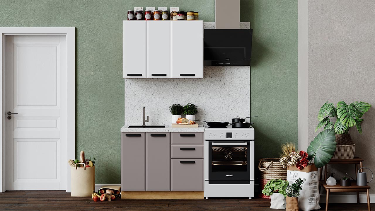 | Габаритный размер набора модулей без учета газовой плиты1 000 | Оттенок фасадаБелый, Коричневый | Цвет фасадаБелый супермат, Мокко супермат |