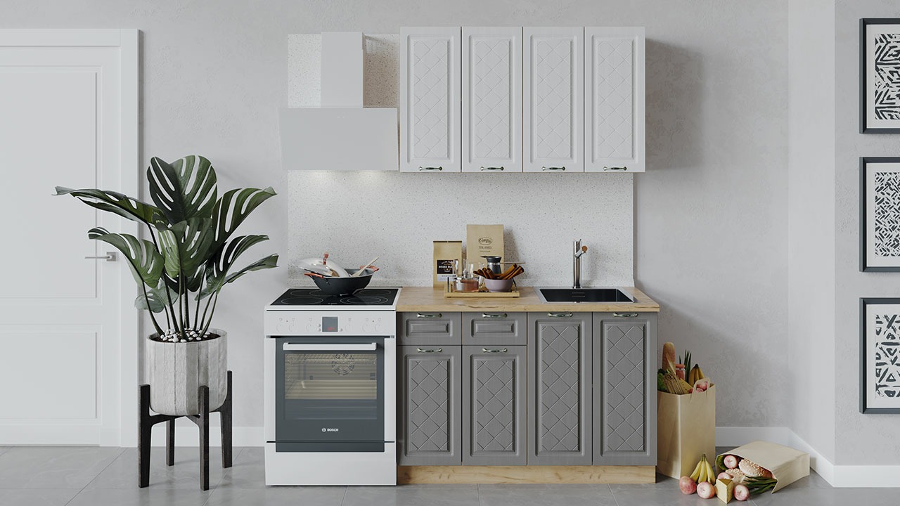 | Габаритный размер набора модулей без учета газовой плиты1 200 | Оттенок фасадаБелый, Серый | Цвет ручкиБрашированная старинная бронза |