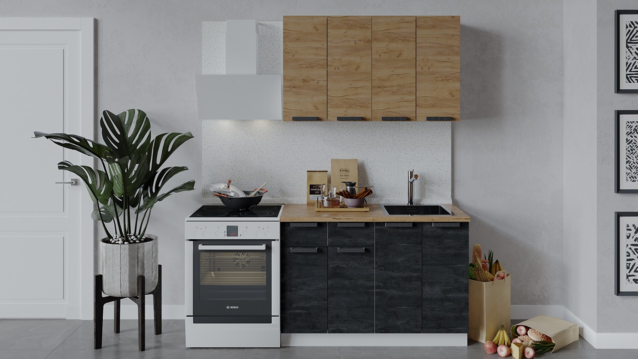 | Габаритный размер набора модулей без учета газовой плиты1 200 | Оттенок фасадаКоричневый, Черный | Цвет ручкиЧерный |