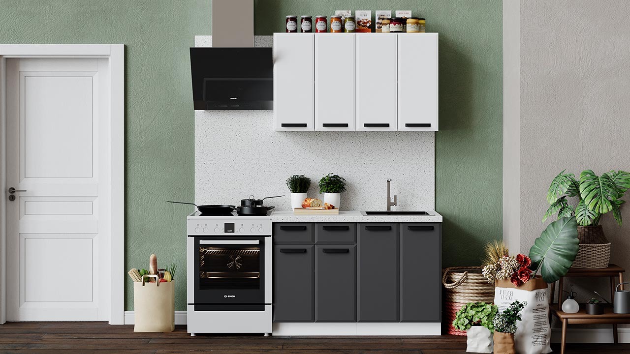 | Габаритный размер набора модулей без учета газовой плиты1 200 | Оттенок фасадаБелый, Серый | Цвет фасадаБелый супермат, Асфальт супермат |