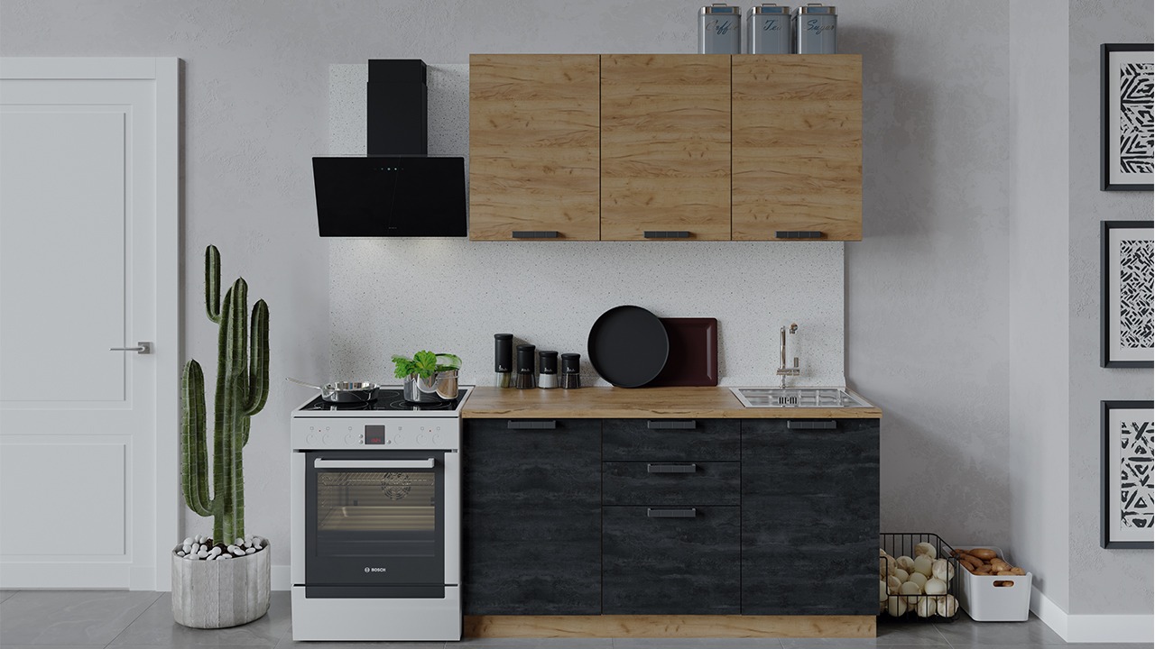 | Габаритный размер набора модулей без учета газовой плиты1 500 | Оттенок фасадаКоричневый, Черный | Цвет ручкиЧерный |