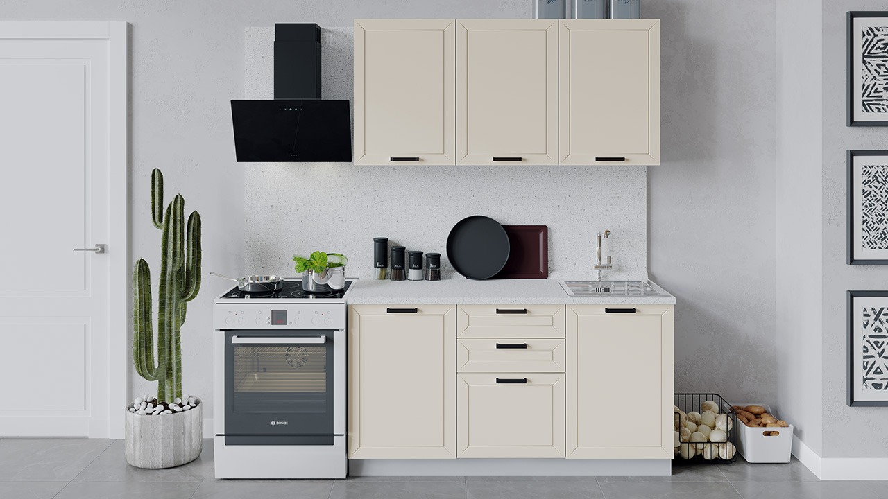 | Габаритный размер набора модулей без учета газовой плиты1 500 | Оттенок фасадаБежевый | Цвет ручкиЧерный |