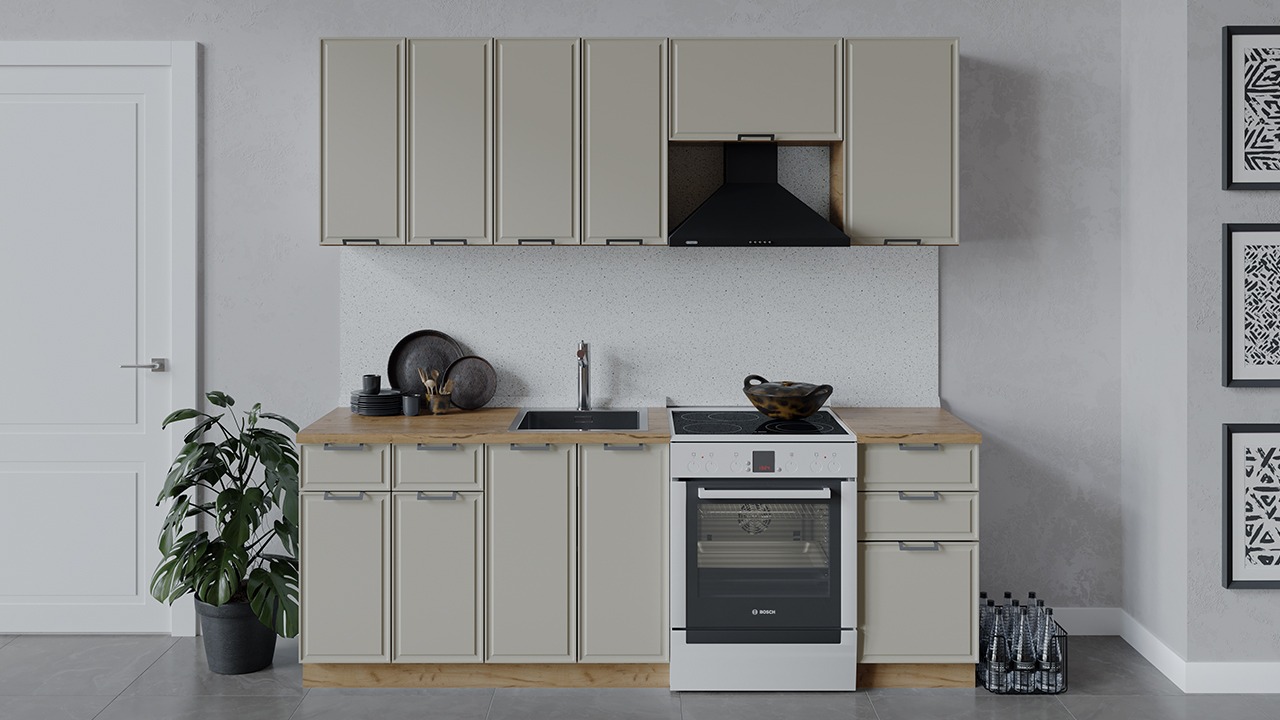 | Габаритный размер набора модулей без учета газовой плиты2 200 | Оттенок фасадаБежевый | Цвет ручкиМеталл |