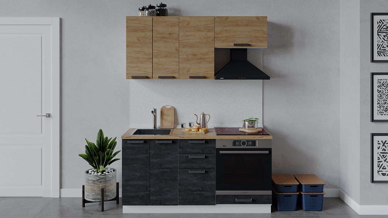 | Габаритный размер набора модулей без учета газовой плиты1 600 | Оттенок фасадаКоричневый, Черный | Цвет ручкиЧерный |