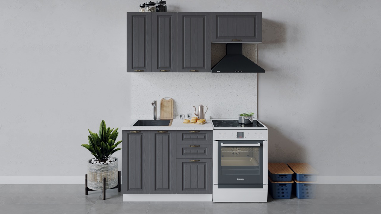 | Габаритный размер набора модулей без учета газовой плиты1 600 | Оттенок фасадаСерый | Цвет ручкиБрашированная старинная бронза |