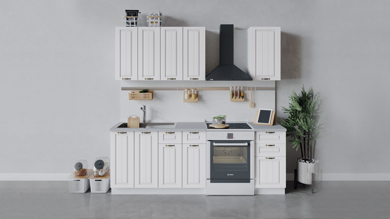 | Габаритный размер набора модулей без учета газовой плиты1 600 | Оттенок фасадаБелый | Цвет ручкиБрашированная старинная бронза |