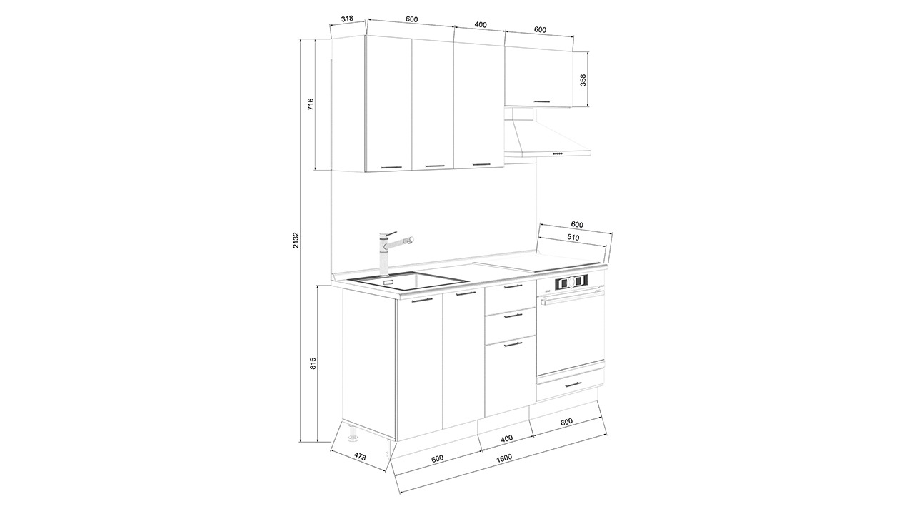 | Габаритный размер набора модулей без учета газовой плиты | 1 600 |