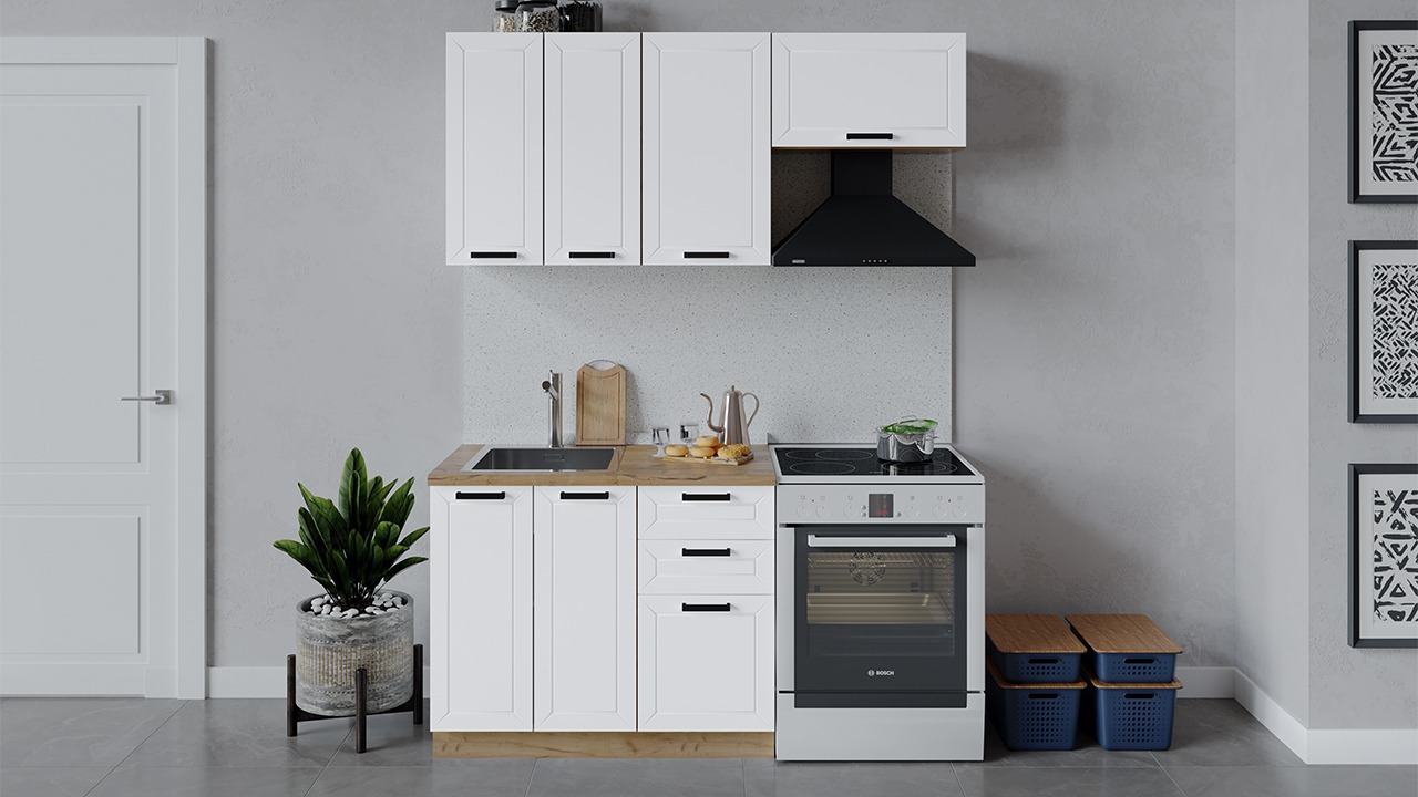 | Габаритный размер набора модулей без учета газовой плиты1 600 | Оттенок фасадаБелый | Цвет ручкиЧерный |