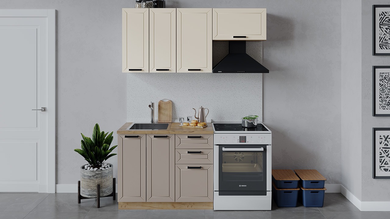 | Габаритный размер набора модулей без учета газовой плиты1 600 | Оттенок фасадаБежевый, Коричневый | Цвет ручкиЧерный |
