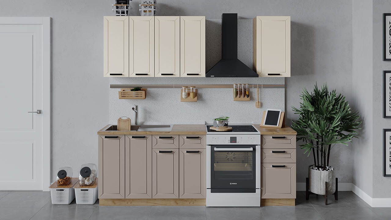 | Габаритный размер набора модулей без учета газовой плиты1 600 | Оттенок фасадаБежевый, Коричневый | Цвет ручкиЧерный |