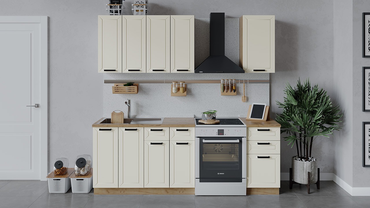 | Габаритный размер набора модулей без учета газовой плиты1 600 | Оттенок фасадаБежевый | Цвет ручкиЧерный |