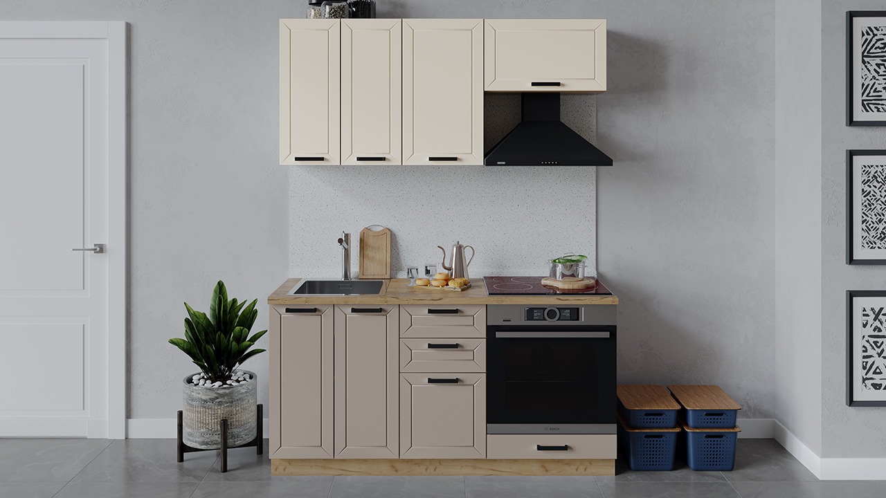 | Габаритный размер набора модулей без учета газовой плиты1 600 | Оттенок фасадаБежевый, Коричневый | Цвет ручкиЧерный |
