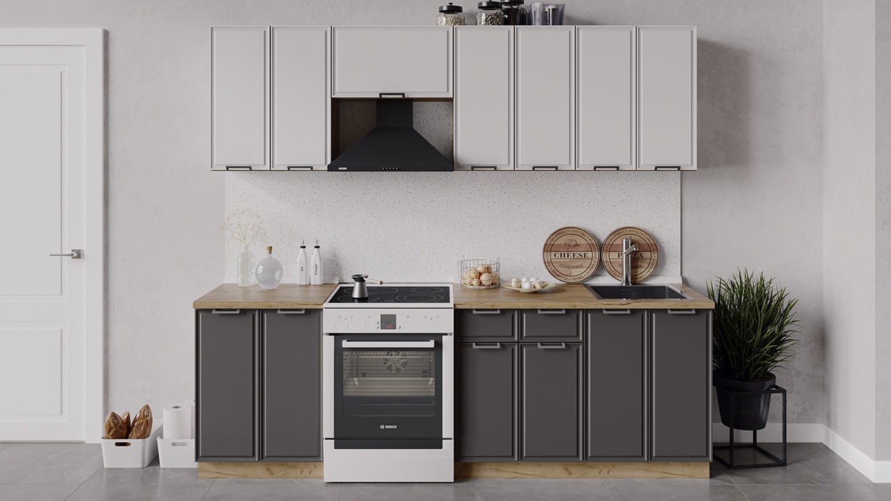 | Габаритный размер набора модулей без учета газовой плиты2 400 | Оттенок фасадаБелый, Серый | Цвет ручкиМеталл |
