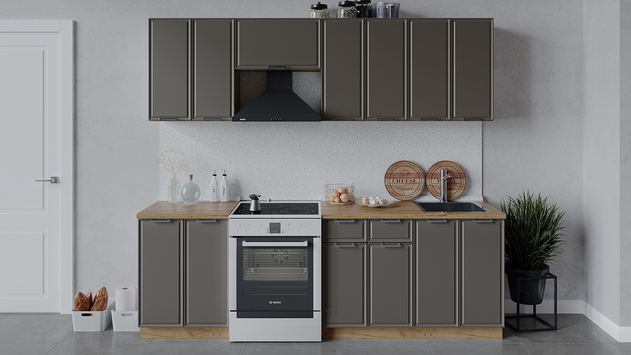 | Габаритный размер набора модулей без учета газовой плиты2 400 | Оттенок фасадаКоричневый | Цвет ручкиМеталл |