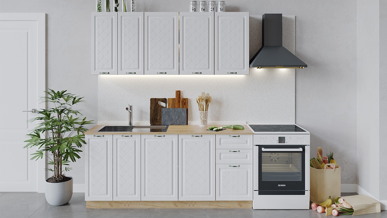 | Габаритный размер набора модулей без учета газовой плиты1 800 | Оттенок фасадаБелый | Цвет ручкиБрашированная старинная бронза |