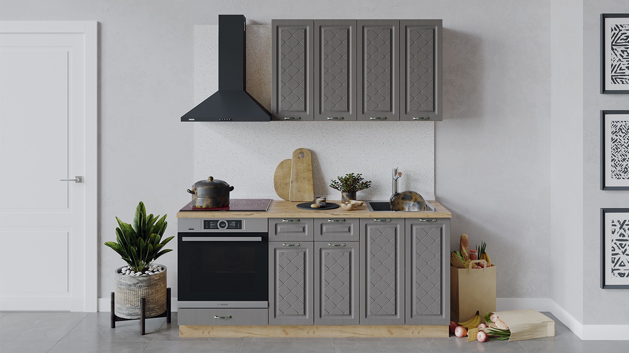 | Габаритный размер набора модулей без учета газовой плиты1 800 | Оттенок фасадаСерый | Цвет ручкиБрашированная старинная бронза |