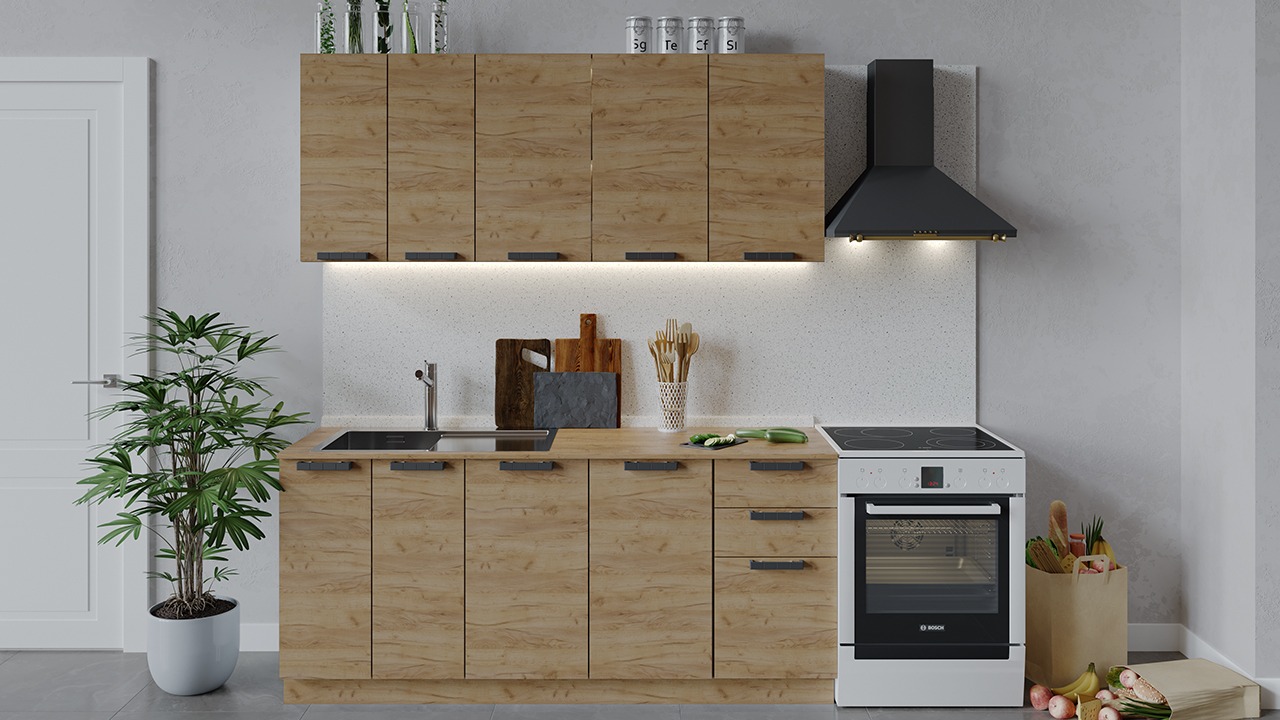 | Габаритный размер набора модулей без учета газовой плиты1 800 | Оттенок фасадаКоричневый | Цвет ручкиЧерный |