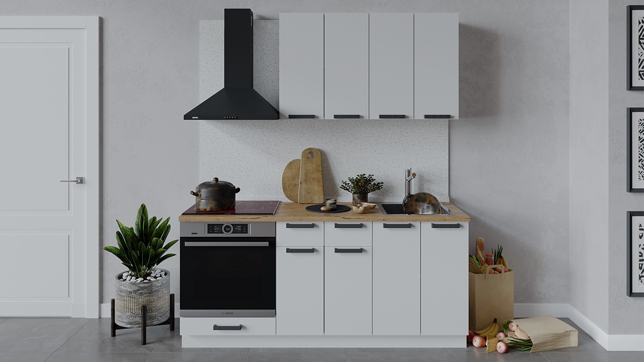 | Габаритный размер набора модулей без учета газовой плиты1 800 | Оттенок фасадаБелый | Цвет ручкиЧерный |