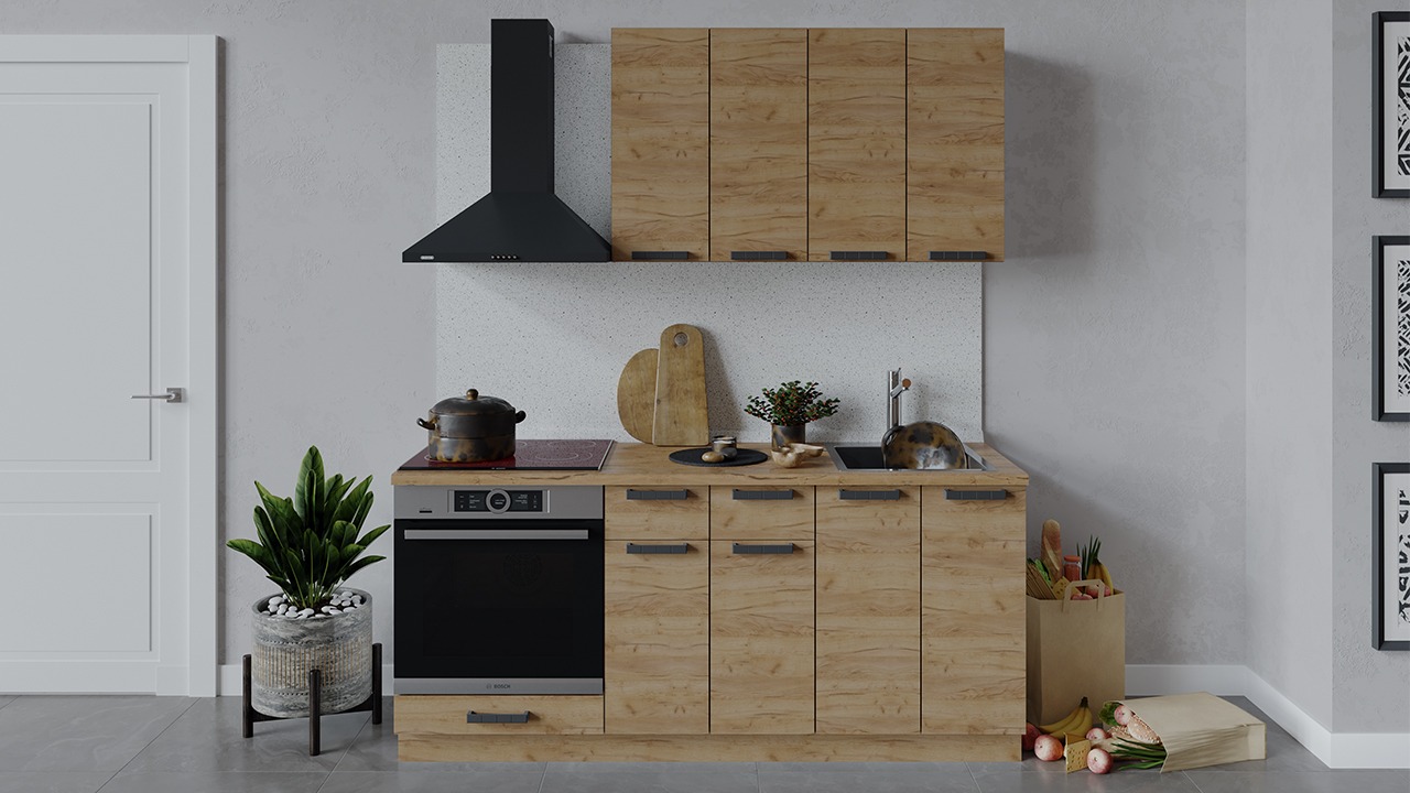 | Габаритный размер набора модулей без учета газовой плиты1 800 | Оттенок фасадаКоричневый | Цвет ручкиЧерный |