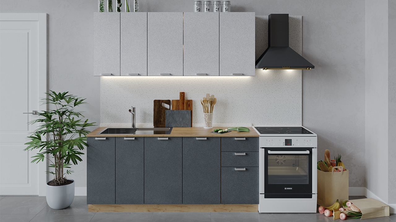 | Габаритный размер набора модулей без учета газовой плиты1 800 | Оттенок фасадаСерый | Цвет ручкиАлюминий |