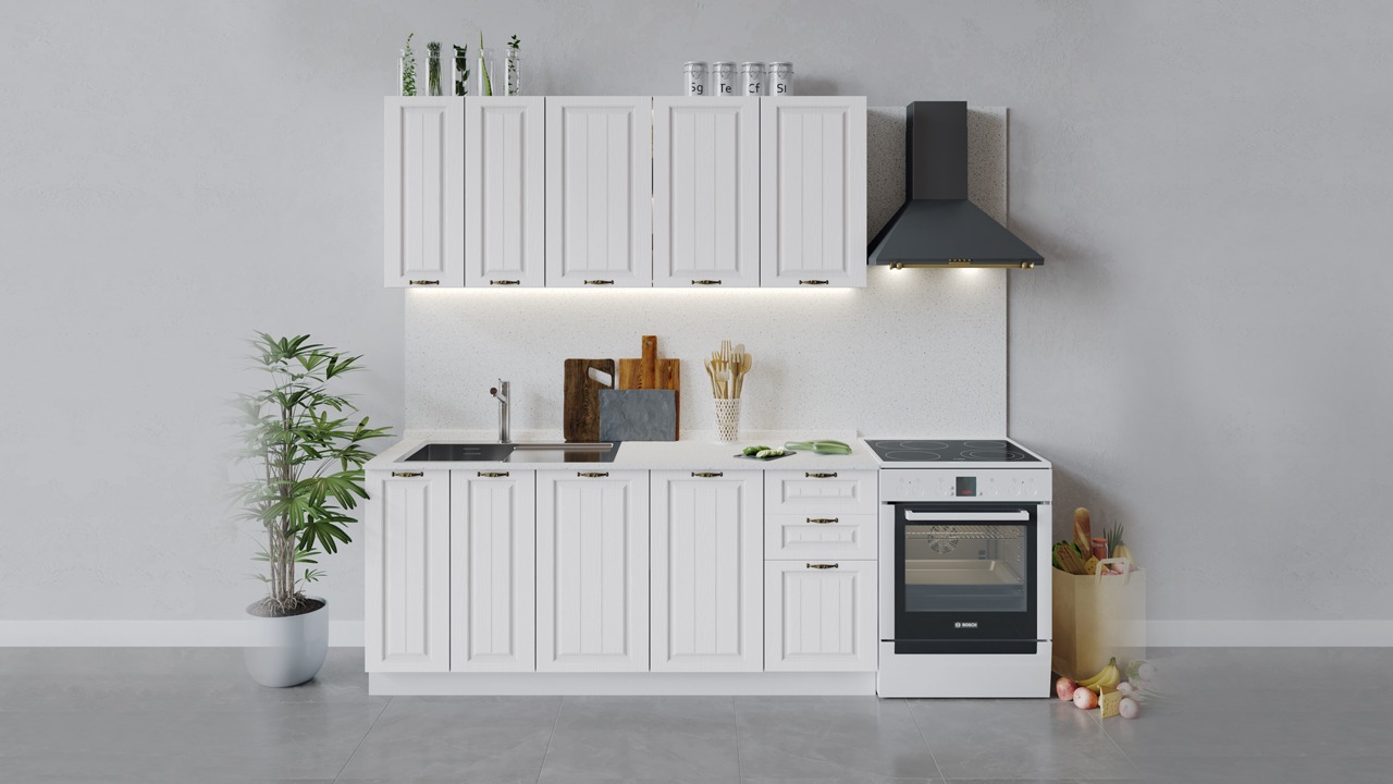 | Габаритный размер набора модулей без учета газовой плиты1 800 | Оттенок фасадаБелый | Цвет ручкиБрашированная старинная бронза |