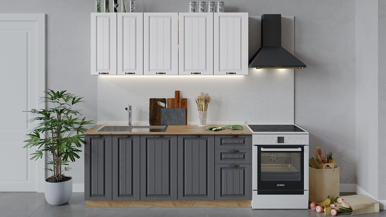 | Габаритный размер набора модулей без учета газовой плиты1 800 | Оттенок фасадаБелый, Серый | Цвет ручкиБрашированная старинная бронза |