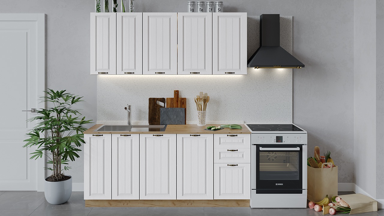 | Габаритный размер набора модулей без учета газовой плиты1 800 | Оттенок фасадаБелый | Цвет ручкиБрашированная старинная бронза |