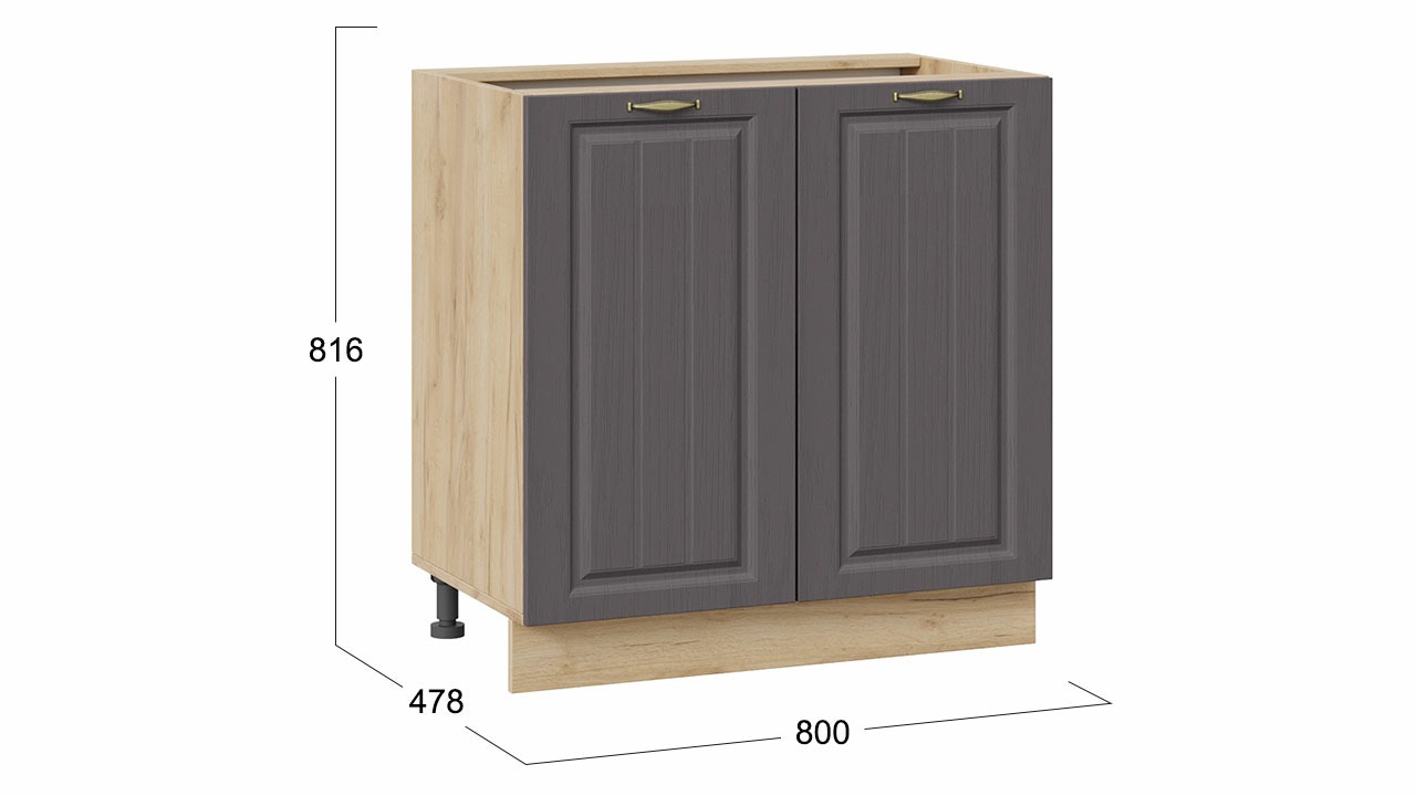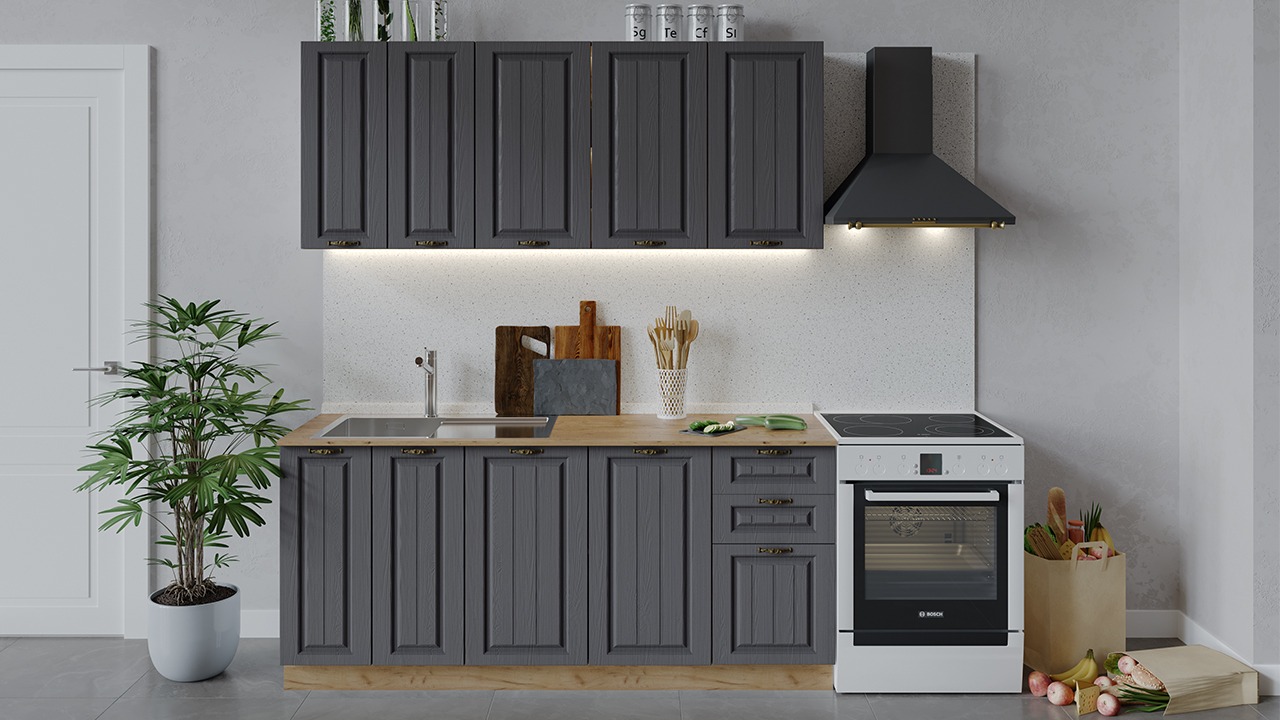 | Габаритный размер набора модулей без учета газовой плиты1 800 | Оттенок фасадаСерый | Цвет ручкиБрашированная старинная бронза |