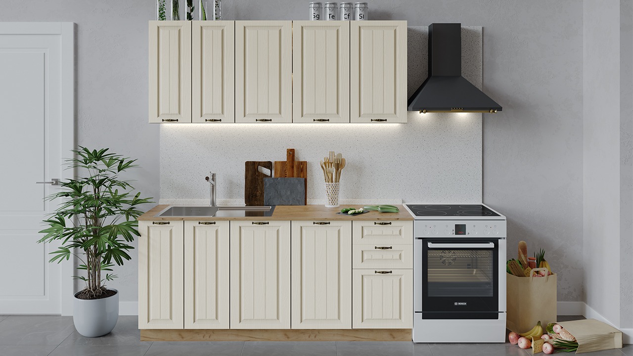 | Габаритный размер набора модулей без учета газовой плиты1 800 | Оттенок фасадаБежевый | Цвет ручкиБрашированная старинная бронза |