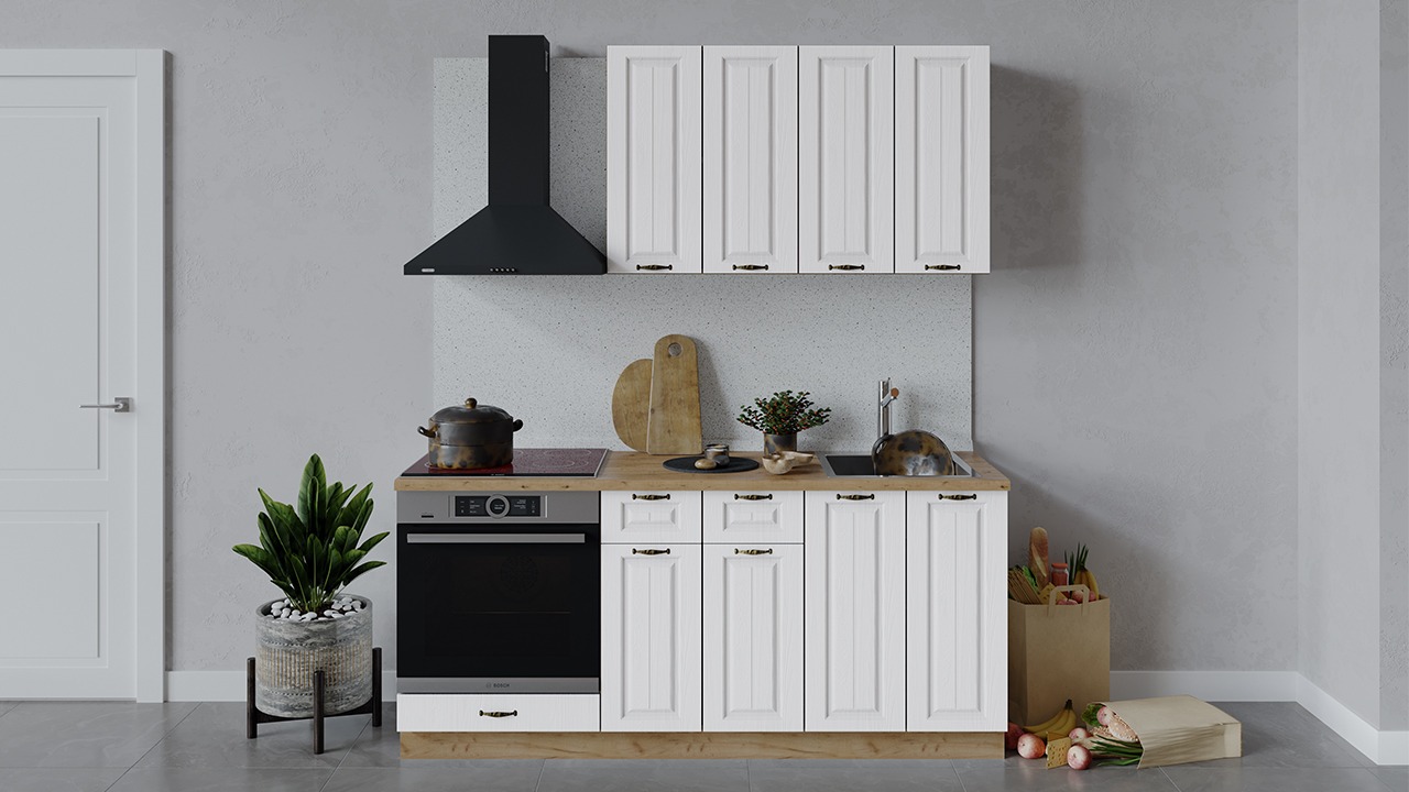| Габаритный размер набора модулей без учета газовой плиты1 800 | Оттенок фасадаБелый | Цвет ручкиБрашированная старинная бронза |