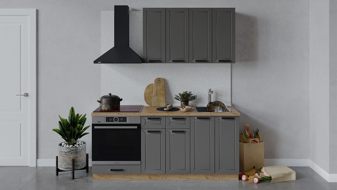 | Габаритный размер набора модулей без учета газовой плиты1 800 | Оттенок фасадаСерый | Цвет ручкиЧерный |