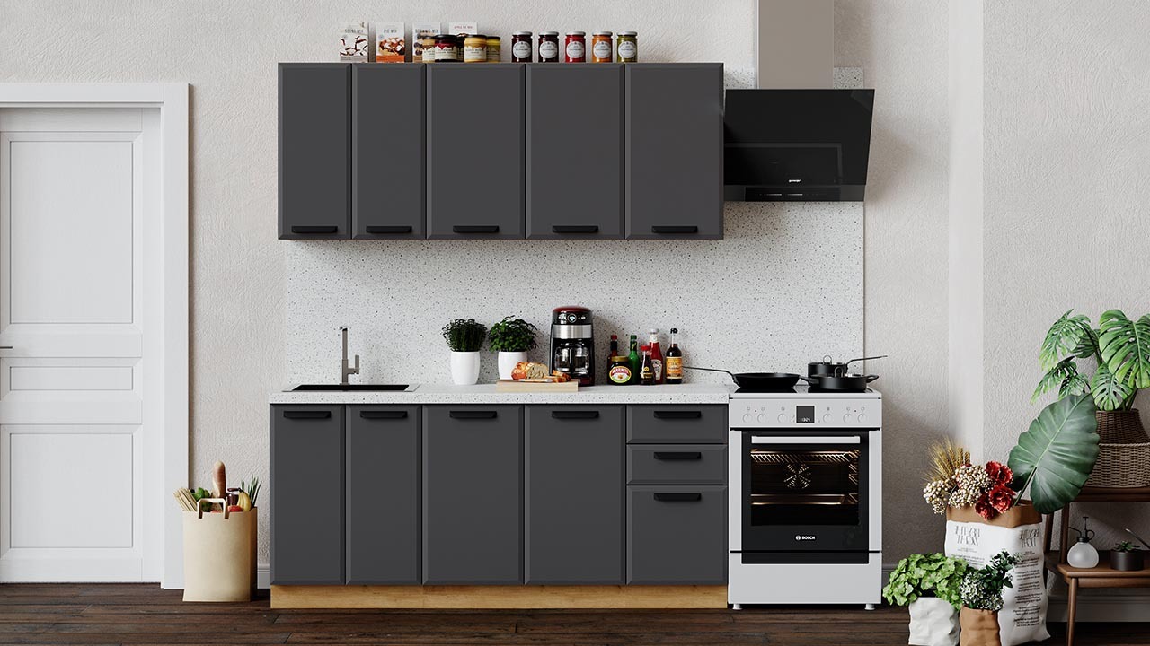 | Габаритный размер набора модулей без учета газовой плиты1 800 | Оттенок фасадаСерый | Цвет фасадаАсфальт супермат |