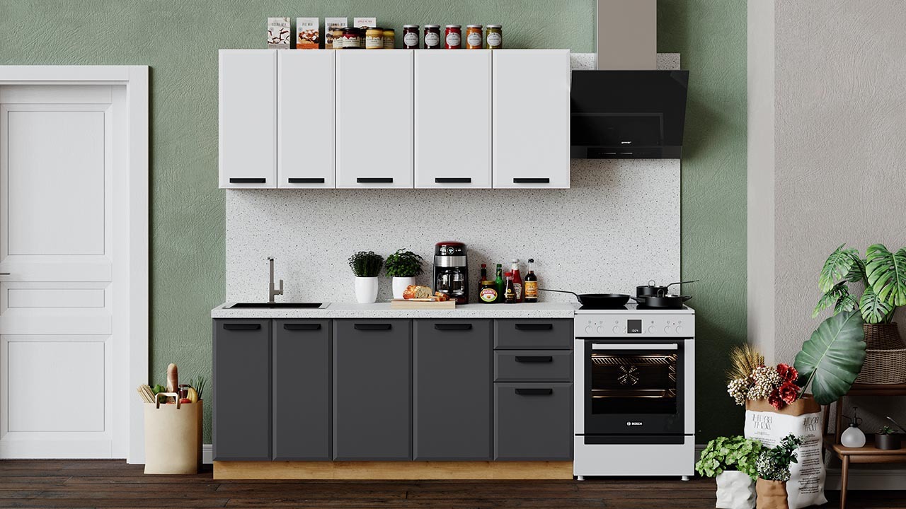 | Габаритный размер набора модулей без учета газовой плиты1 800 | Оттенок фасадаБелый, Серый | Цвет фасадаБелый супермат, Асфальт супермат |