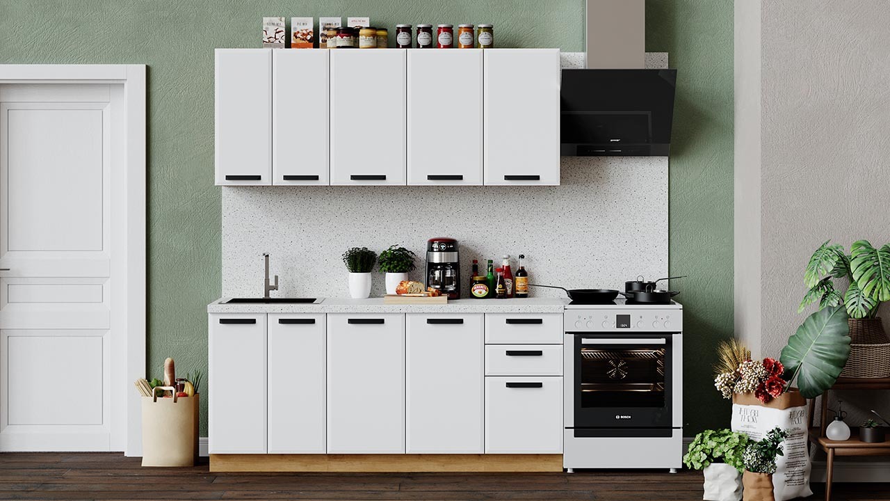 | Габаритный размер набора модулей без учета газовой плиты1 800 | Оттенок фасадаБелый | Цвет фасадаБелый супермат |