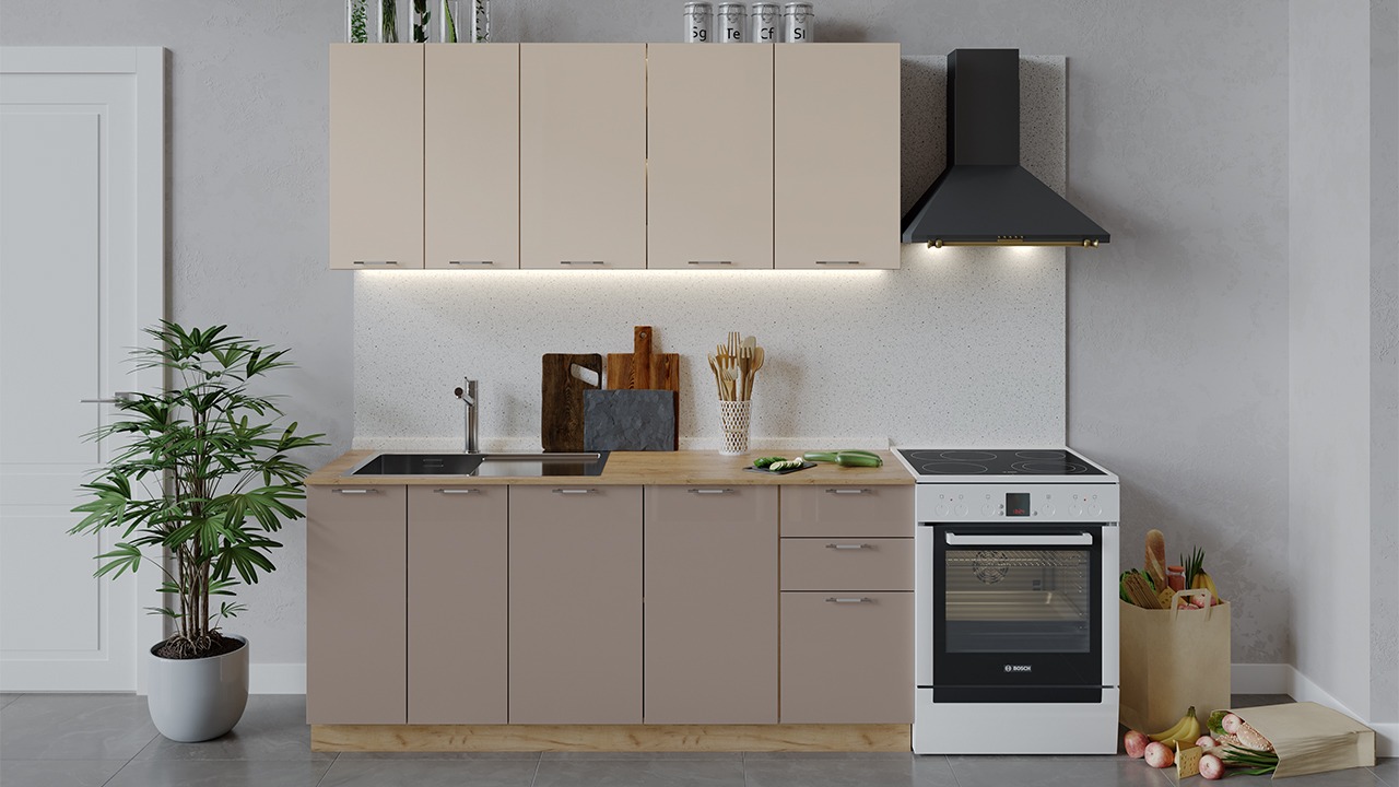 | Габаритный размер набора модулей без учета газовой плиты1 800 | Оттенок фасадаБежевый, Коричневый | Цвет ручкиАлюминий, Хром |