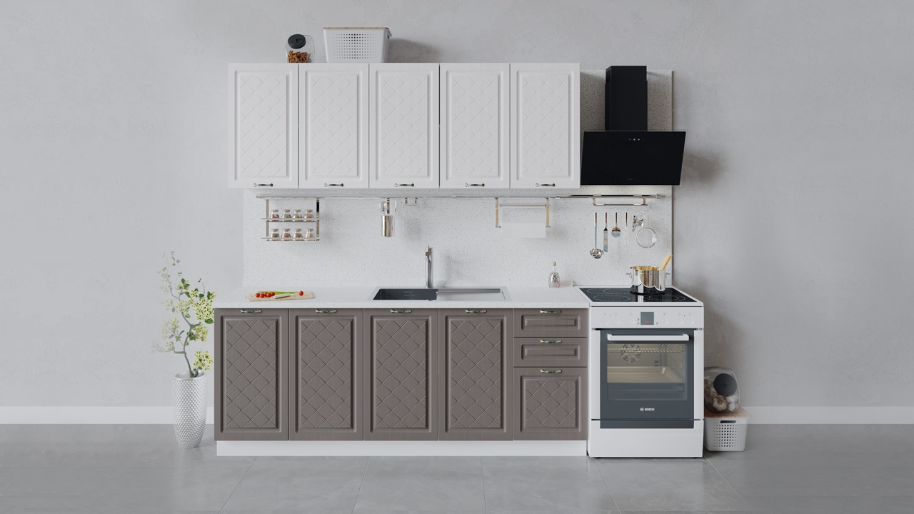 | Габаритный размер набора модулей без учета газовой плиты2 000 | Оттенок фасадаБелый, Серый | Цвет ручкиБрашированная старинная бронза |