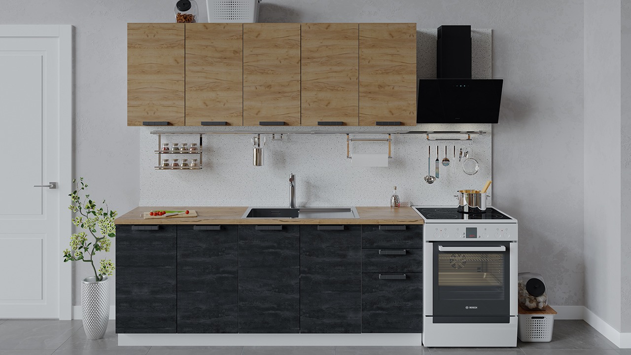 | Габаритный размер набора модулей без учета газовой плиты2 000 | Оттенок фасадаКоричневый, Черный | Цвет ручкиЧерный |