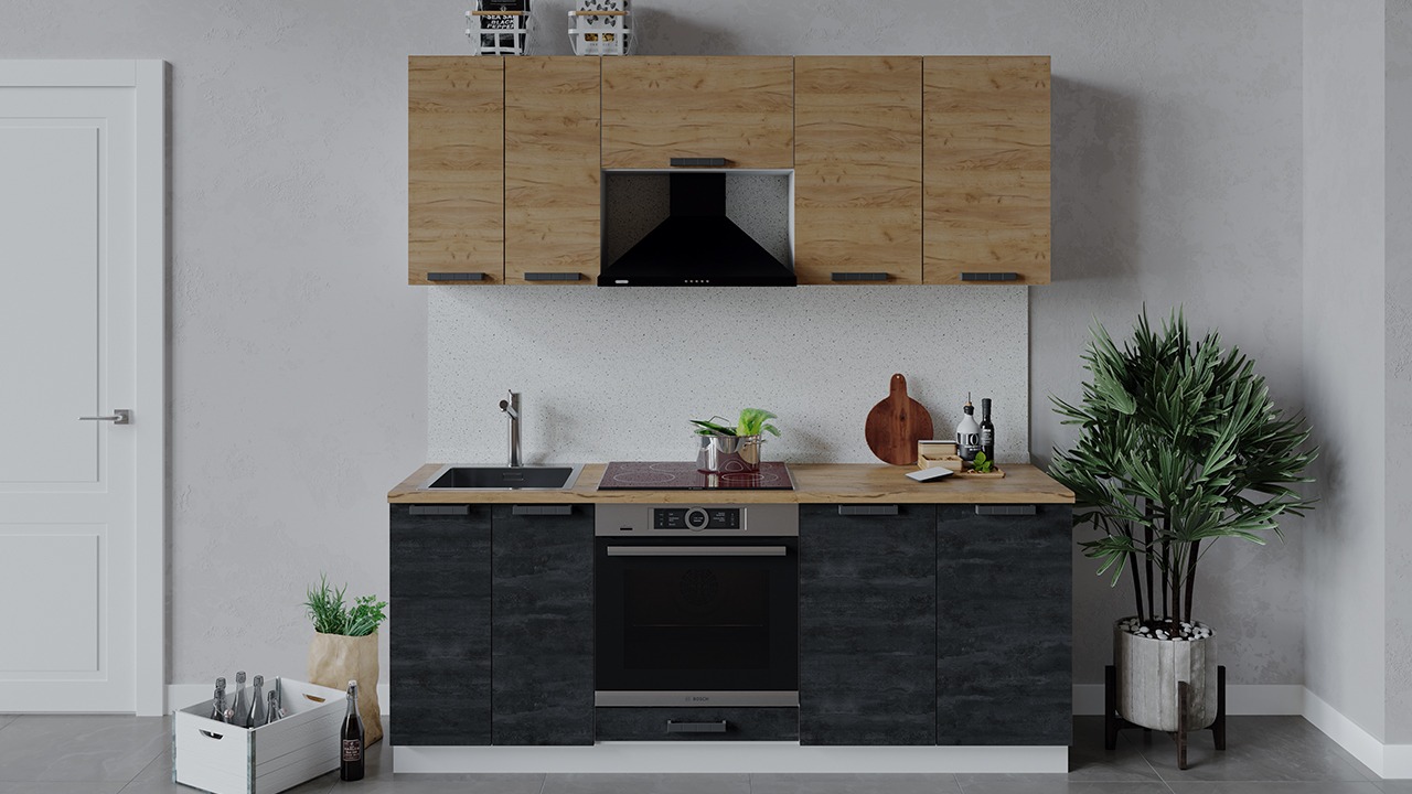 | Габаритный размер набора модулей без учета газовой плиты2 000 | Оттенок фасадаКоричневый, Черный | Цвет ручкиЧерный |