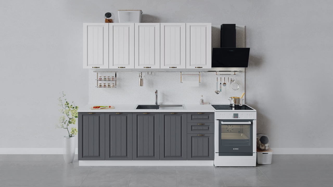 | Габаритный размер набора модулей без учета газовой плиты2 000 | Оттенок фасадаБелый, Серый | Цвет ручкиБрашированная старинная бронза |